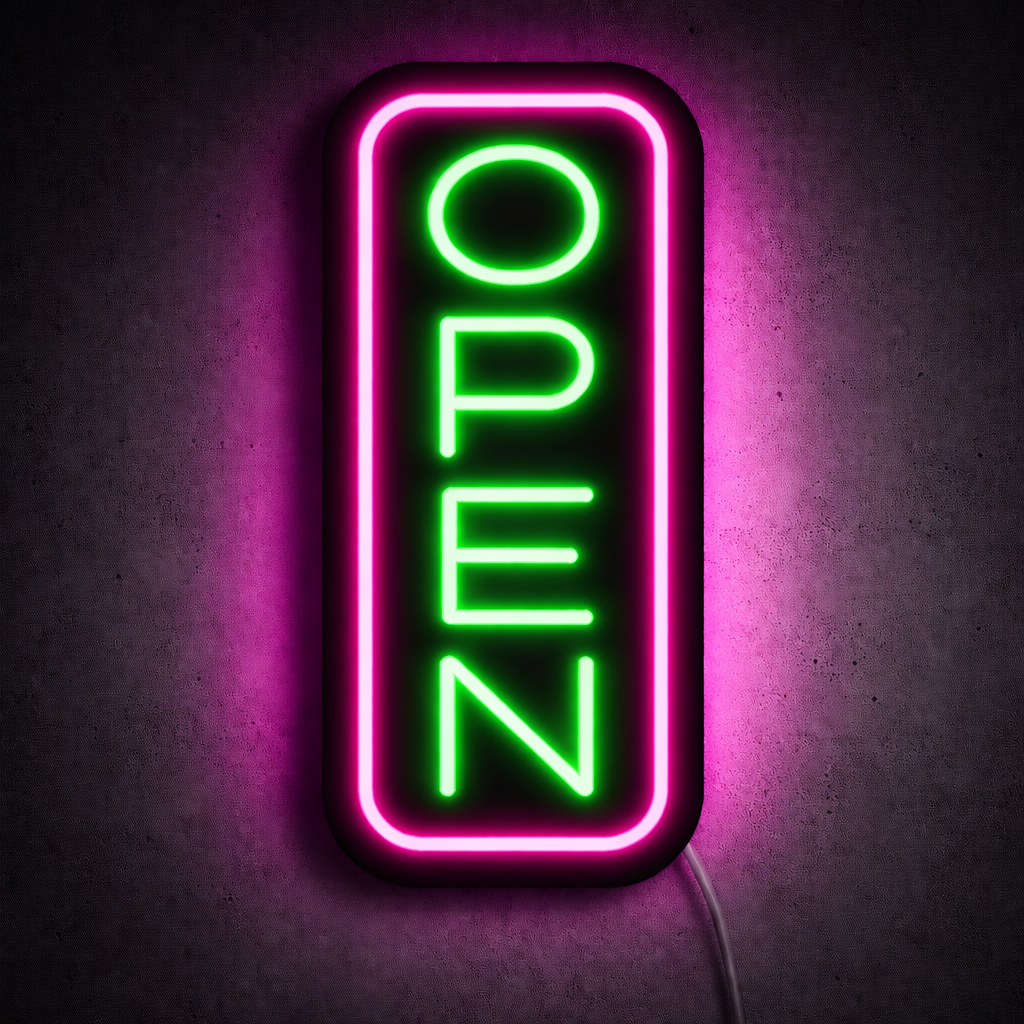 Gjør din bedrift synlig med vårt 'open' led neonskilt. Dette skreddersydde skiltet er perfekt for å ønske kundene velkommen med stil. Med en rask levering og muligheten til å tilpasse farge etter eget ønske, kan du skape et blikkfang som matcher din bedrifts identitet.