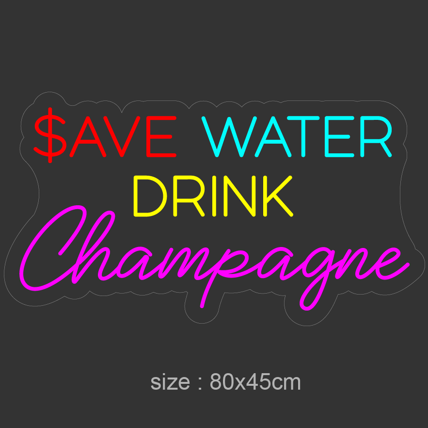Gi rommet ditt et snev av sjarm med vårt ‘save water’ led neonskilt. Dette blikkfanget av et neonskilt tilbyr en morsom tvist med budskapet ‘save water drink champagne’, perfekt for å setyrke miljøbevissthet med en humoristisk undertone. Det er ideelt for barer, arrangementer eller som en unik dekorasjon i hjemmet. Med sine klare og livlige farger gir det en varm og innbydende glød til ethvert rom.